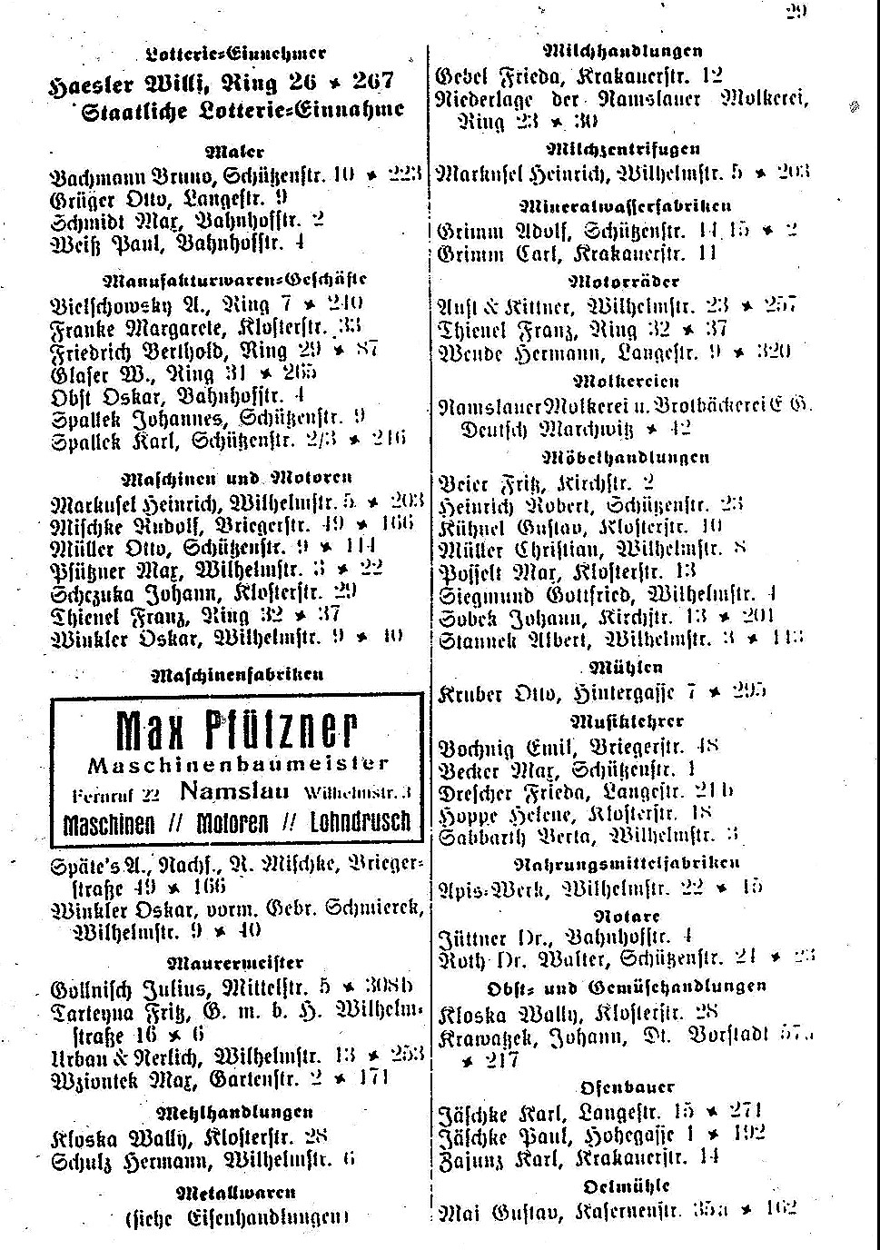 Motorräder, Molkereien, Möbelhandlungen, Mühlen, Musiklehrer, Nahrungsmittelfabriken,