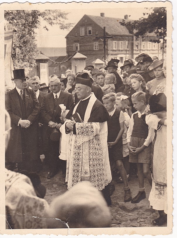 Pfarrer Ludwig - Einführung in Strehlitz - 1941 mit Zylininder: Herr Benneke sen. im Hintergrund: Haus von Kaufmann Rosumek |