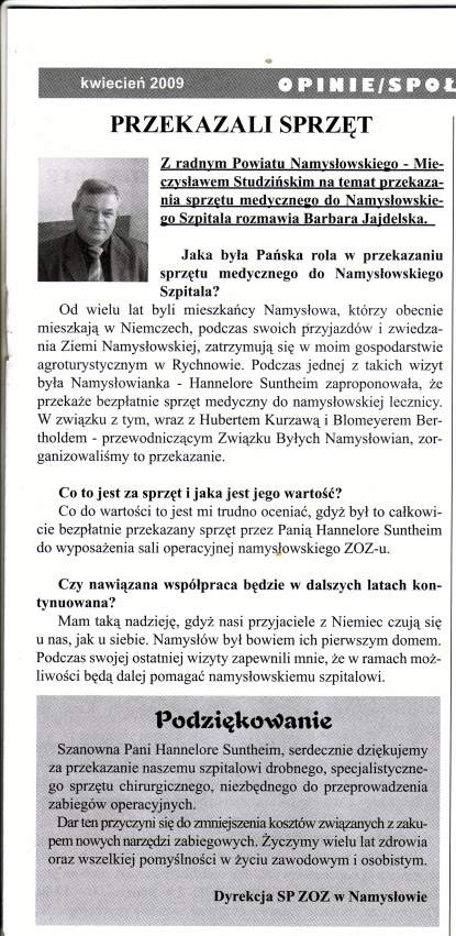 Suntheim, vorgeschlagen, medizinische Geräte an das Namslauer Krankenhaus