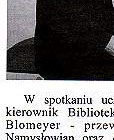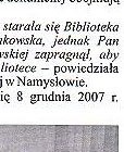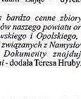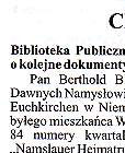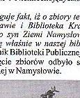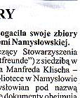 Eine wertvolle Sammlung Die öffentliche Bibliothek in Namslau bereicherte ihren bisherigen Bücherbestand um weitere historische Dokumente, die Namslau und ihre Umgebung betreffen. Der Vorsitzende der Deutschen Minderheit aus Euskirchen überreichte der Bibliothek im Namen von Herrn Manfred Klisch, einem ehemaligen Einwohner aus Lorzendorf eine Sammlung von 84 Nummern einer Quartalausgabe des "Namslauer Heimatrufes"Die deutschsprachigen Dokumente umfassen die Jahre 1956-1979. Hier müssen wir darauf hinwei-sen, daß sich für diese Dokumente die Nationalbibliothek Warschau und die Krakauer Bibliothek interessierten. Herr Manfred Klisch, Sohn der Namslauer Erde aber wünschte sich, daß sich diese Kollektion in der Namslauer Bibliothek befinden soll, so sagte uns die Leiterin der Städtischen Bibliothek Frau Theresa Chruby. Die offizielle Übergabe der Sammlung hat am 8.Dezember in der Städtischen Bibliothek stattgefunden. An dem Treffen haben (von rechts) - die Leiterin der Bibliothek Frau Theresa Chruby - Herr Berthold Blomeyer, der Verbandsvorsitzender der Namslauer Heimatfreunde- Herr Adam Zajac, der Direktor des Nams- lauer Kulturhauses teilgenom-men. "Das ist für uns eine sehr wichtige Sammlung, die sehr interessant für die Einwohner unseres Krreises sein wird und den Studenten der Breslauer und Oppelner Universität dienen wird. Die Studenten suchen die mit Namslau und Schlesien und ihren Einwohnern verbundenen Angaben." "Die Dokumente befinden sich im Lesesaal" der Bibliothek" sagte Frau Teresa Chruby |