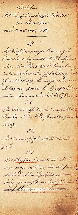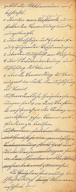 zettel oder Akklmation und beschließt 1. über dem vom Vorstand zu erstattenden Verwaltungs- und Rechenschaftsbericht 2. über Vorschläge und Entwürfe auszuführender Verschönerungen 3. über den Ausschluss von Mitgliedern 4. über Statutenänderungen und Auflösung des Vereins 5. über die Verwen -dung des Vermögens im Falle der Auflösung des Vereins Außerordentliche Hauptversammlungen sind von dem Vorstand nach Ermeßen oder Antrag von mindestens 10 Vereinsmitgliedern zu berufen. Außerdem findet im Sommer und im Herbst je eine gemütliche Versammlung statt. Zeit und Ort der Versammlung sind in dem Namslauer Stadtblatt vorher bekannt zu machen. §7 Die Hauptversammlung beschließt durch Stimmen-mehrheit, den |